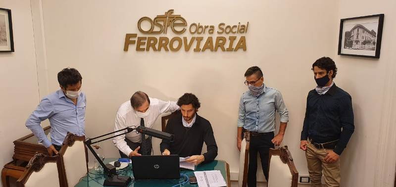 El Dr. Roberto Canay; la Gerenta General de OSFE, Lic. Sandra Paz; el miembro del Bloque OSFE-LF, Cro. «Cacho» Garcia; el Secretario General Adjunto de Tapiales UF, Cro. Darío Boero; la Secretaria de Acción Social de Tapiales UF, Cra. Vanesa Fernández; los delegados de Tapiales UF, Micaela Falzoi y Pablo Romero.