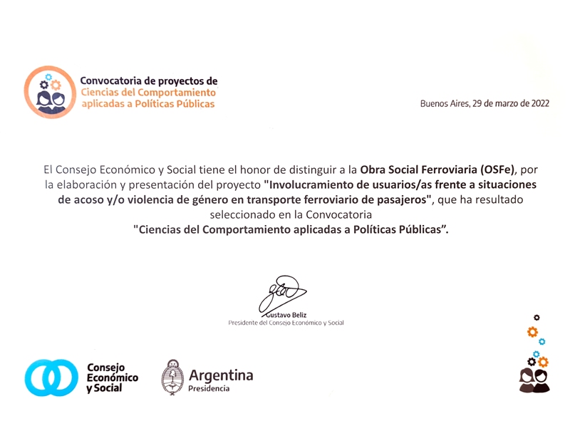 Asimismo, OSFE recibió una DISTINCIÓN por la elaboración y presentación del proyecto “Involucramiento de usuarios/as frente a situaciones de acoso y/o violencia de género en transporte ferroviario de pasajeros», que fue seleccionado en la ConvocatoriaCiencias del Comportamiento aplicadas a Políticas Públicas”.