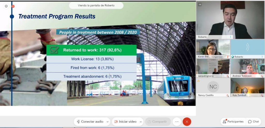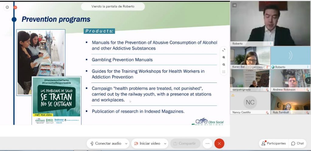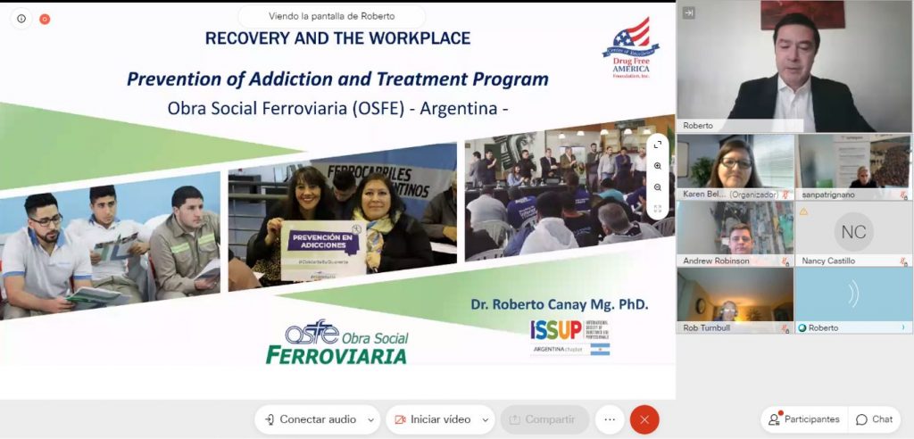 La exposición se realizó el 29 de octubre del corriente por medio de un seminario web, donde el Director del Instituto Forum Vitae de OSFE, Dr. Roberto Canay,  presentó la experiencia de la Obra Social en prevención de adicciones, concientización y reinserción laboral, que desarrolla hace más de 10 años para los trabajadores y trabajadoras ferroviarios.