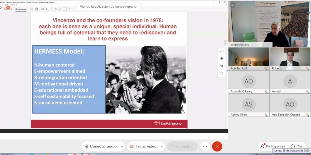 El programa de Italia fue expuesto por la Directora en Relaciones Internacionales y Prevención de San Patrignano, Monica Barzanti,  quién explicó el trabajo de la comunidad para desmantelar el comportamiento adictivo, introduciendo elementos positivos en la vida, practicando la ética de la responsabilidad y la rendición de cuentas, educando a las personas y nutriendo sus talentos, gracias a la capacitación laboral y las habilidades, lo que lleva al empoderamiento individual y apunta a la reintegración social final.